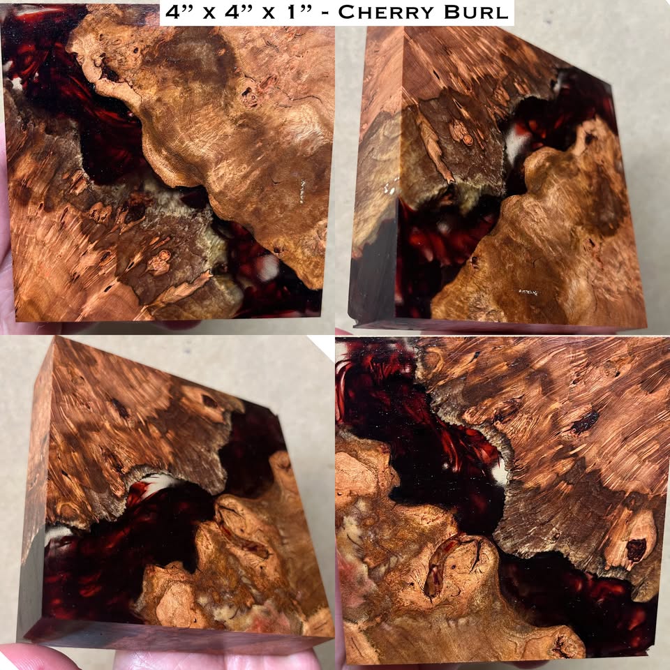 "Blood in the Water" Stabilized Cherry Burl Hybrid Turkey Pot Call Block. Pressure casted with Alumilite Clear Slow at 80psi for premium results. Shipping for multiple purchases of the same type of blanks automatically combine to save on shipping costs. $150+ of Pot Call Blanks ship for free! 4” square by 1" thick minimum. Lightly oiled to show color & figure.