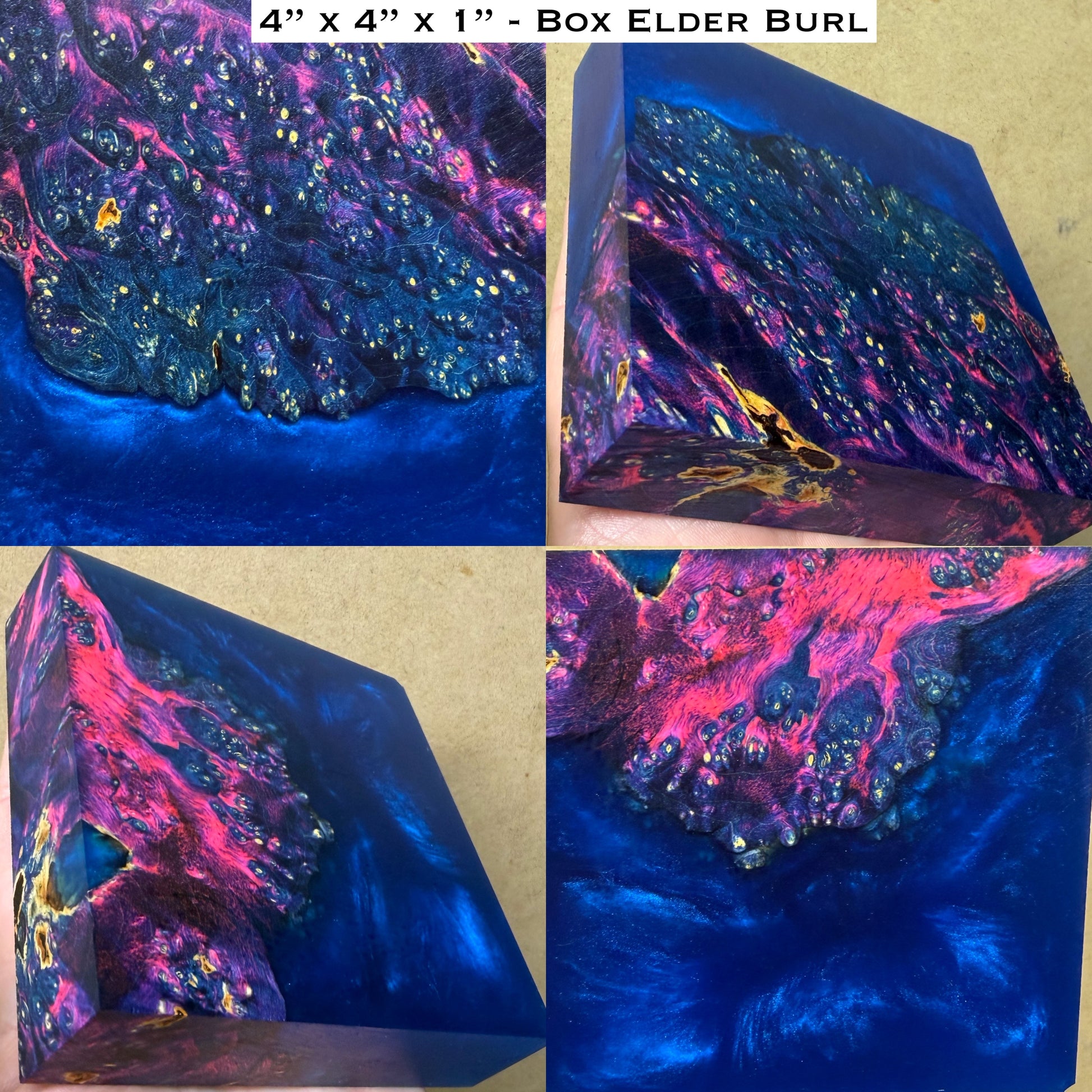 Stabilized Box Elder Burl Hybrid Turkey Pot Call Block. Pressure casted with Alumilite Clear Slow at 80psi for premium results. Shipping for multiple purchases of the same type of blanks automatically combine to save on shipping costs. $150+ of Pot Call Blanks ship for free! 4” square by 1" thick minimum. Lightly oiled to show color & figure.