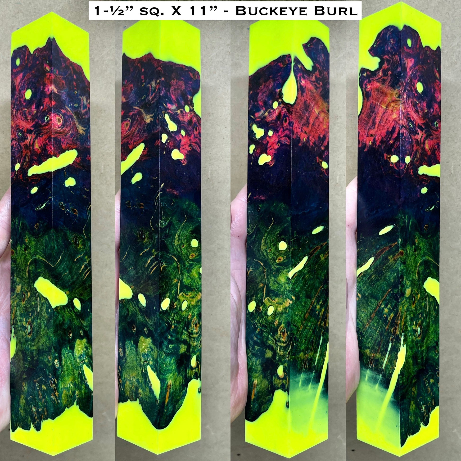 Stabilized Buckeye Burl 11” Hybrid XL Call / Cue Block. Photos show all sides. Cast with Alumilite Clear Slow 1-1/2” square by 11” long. Lightly oiled to show color/figure.