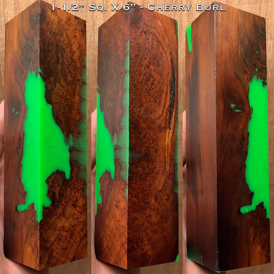 Stabilized Cherry Burl Hybrid Call / Handle Block. Pressure casted with Alumilite Clear Slow at 80psi for premium results. Shipping for multiple purchases of the same type of blanks automatically combine to save on shipping costs. $150+ of Duck Call Blanks ship for free! 1-1/2” square by 6” long. Lightly oiled to show color/figure.