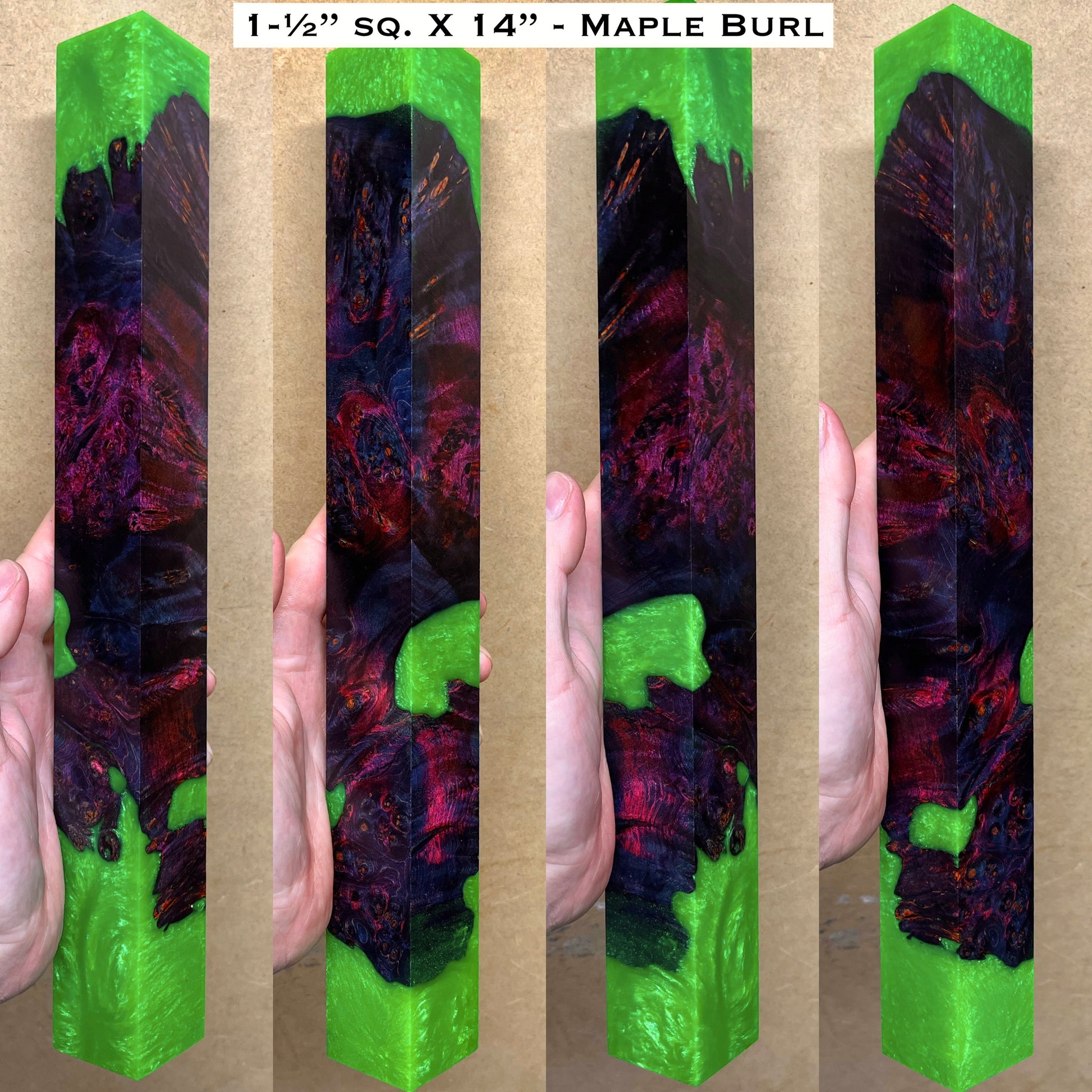 Black Dye Stabilized Maple Burl 14” Hybrid Cue Block. Photos show all sides. Cast with Alumilite Clear Slow 1-1/2” square by 14” long. Lightly oiled to show color/figure.