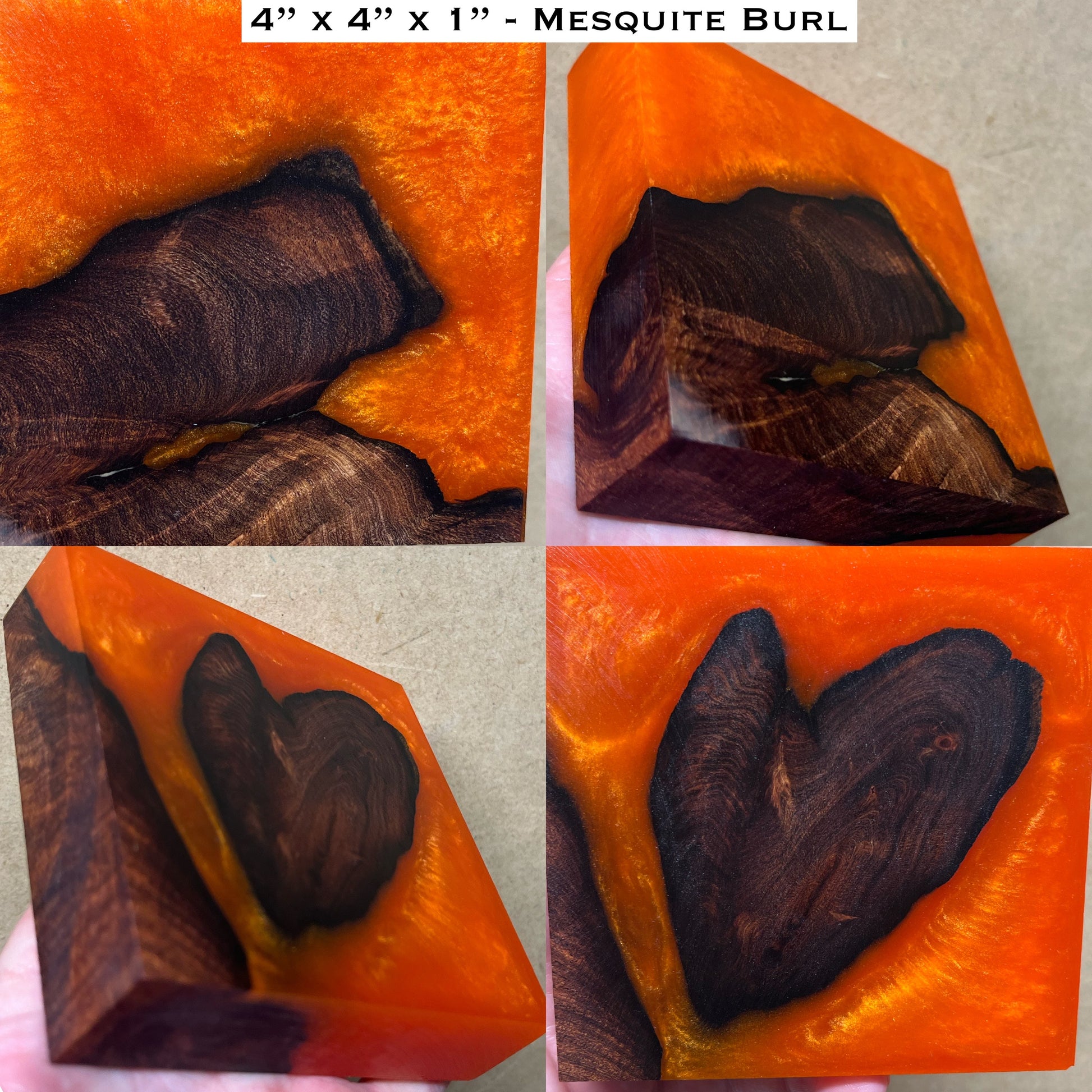 Stabilized Mesquite Burl Hybrid Turkey Pot Call Block. Pressure casted with Alumilite Clear Slow at 80psi for premium results. Shipping for multiple purchases of the same type of blanks automatically combine to save on shipping costs. $150+ of Pot Call Blanks ship for free! 4” square by 1" thick minimum. Lightly oiled to show color & figure.